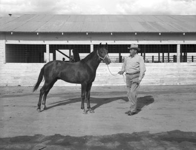 Midland, Texas is holding their sixth annual rodeo and horse show. Colorful scenes and people packed in for opening day. Donald Hutt is posing with his Quarter Horse colt, which he entered in the horse show. Mr. Hutt is a rancher from Midland, Texas. He is dressed in a cowboy hat, striped dress shirt, and trousers. The stable is in the background.