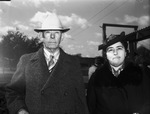 The fourth Annual Brown County Hereford Breeders sale is attracting many interested cattle buyers and ranchers. Mr. and Mrs. John McInnis are attending the sale. They are from the firm Cox & McInnis at Byrds, Texas. Mr. McInnis is wearing a hat, suit, tie, and coat. Mrs. McInnis is dressed in a hat, plaid blouse, and a coat. Published in the Fort Worth Star-Telegram morning edition, February 9, 1940.