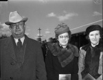 The fourth Annual Brown County Hereford Breeders sale is attracting many interested cattle buyers and ranchers. Shown here, from left to right, are Mr. and Mrs. Mans Hoggett of Mertzon, Texas, and Mrs. Roy Largent of Bownwood, Texas. Mr. Hoggett is dressed in a cowboy hat, three piece suit, a tie, and a coat. Mrs. Hoggett is wearing a hat, coat, and a fur shawl. Mrs. Largent is dressed in a hat and a fur coat. Published in the Fort Worth Star-Telegram morning edition, February 9, 1940.