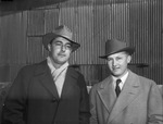 The fourth Annual Brown County Hereford Breeders sale is attracting many interested cattle buyers and ranchers. Shown here, from left to right, are Edwin R. Johnson and Tommie Brook. Mr. Johnson is secretary of the Texas Hereford Association. He is wearing a tilted hat, scarf, and coat. Mr. Brook is a ranchman in Brady, Texas. He is dressed in a hat, suit, a tie, and coat. The men are standing in front of the barn. Published in the Fort Worth Star-Telegram morning edition, February 9, 1940.