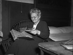 In this picture is Mrs. A. E. Chambers of Detroit, Texas. She is the sister of Admiral James O. Richardson, the new commander-in-chief of the United States fleet. Mrs. Chambers is sitting on a chair, thumbing through a scrapbook. She is wearing a blouse and a skirt. Published in the Fort Worth Star-Telegram morning edition, February 18, 1940.