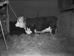 Here are some of the prized Herefords on the M. L. Smiley Meadow Lawn Farm which is in Lamar County, ten miles west of Paris, Texas. Pictured in the barn in a pile of hay is M. L. F. Lady Royal D 10th. She was calved on November 7, 1938. She will be entered in the senior calf competition at the Southwestern Exposition and Fat Stock Show. Published in the Fort Worth Star-Telegram morning edition, February 21, 1940.