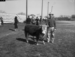 Here are some of the interesting scenes found by the Chuck Wagon Gossiper at the eighth annual San Saba County Livestock Show. In this picture is W. A. Burnam, the manager of the O. P. Leonard Ranch, with one of the bull calves bred on the ranch and exhibited without special feeding. This registered Hereford calf will be kept to replace his sire. Mr. Burnam is wearing a hat, suit, and a coat. There are people standing in the background near the bleachers. Published in the Fort Worth Star-Telegram morning edition, February 23, 1940.
