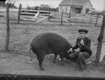 Fisher County Club Show contestant William Levens, Roby, Texas 4-H Club boy, with his grand champion barrow. Levens is standing outside a fence bending down next to his winning Barrow holding a stick in his left hand.