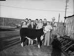 Wichita Falls ninth annual club show entrant Charles Baker is at the halter of his baby beef. Small boy is Kennith Baker and back of him is W. W. Rice, county agent. From right to left of Charles Baker other 4-H Club boys are: Gaylon Scott, Joe Barton, Junior Montandon, Wade McGuire, Elton Scott, Finis Bratcher and Hope Bratcher. All the boys are standing side by side behind the Calf in pants and a button down shirt, jacket, or vest.