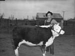 Jones 4-H Club Show. Glenn Tarpley, with his first prize heavyweight winning calf. Tarpley is standing outside wearing a jumper on top of a button down shirt with a hat on, and holding his winning calf by its leash.