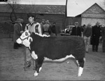 Jones 4-H Club Show winner Weldon Barbee with his first prize light-weight calf. Barbee is seen standing outside in his cowboy gear holding his winning calf by the leash strap.