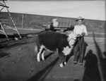 Wichita Falls Livestock Show winner H. L. Martin, son of Mr. and Mrs. H. T. Martin of Throckmorton, Texas with his prize winning calf, is standing outside next to his calf holding it by the leash, wearing a cowboy hat, button down shirt, and pants.