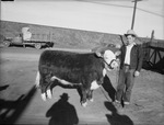 Wichita Falls Livestock Show winner Joe Kennedy, Wichita County 4-H Club member, shown standing next to his prize winning calf, holding the calf by it's leash.