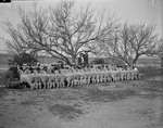 San Angelo Fat Stock Show. Group of lambs exhibited by Sterling County 4-H Club boys. Back of the boys and lambs are H. P. Malloy County farm agent, and Miss Mitzi Broome. They are all standing outside in front of each lamb.
