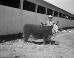 San Angelo Fat Stock Show. Billy Arledge, 17, Roscoe 4-H Club boy, with his prize winning calf, is outside standing in front of a shed, holding his calf by the leash. He is wearing a hat, button down shirt, and jacket.