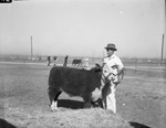 San Angelo Fat Stock Show. Jack Parker, 4-H Club boy of Roby, with his prize winning baby beef, is standing outside holding his winning beef by the leash, wearing a jumper suit and hat. In the background there are other men with their calves.