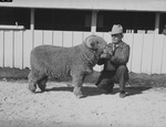 San Angelo Fat Stock Show. P. T. Underwood of Denton and his champion Rambouillett ram, is seen outside standing on a sandy or dry muddy ground. Underwood is holding his Ram by it's chin skin.