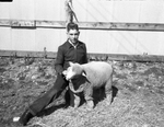Image shows Mason County 4-H Club Show was held on February 7 and 8. Shown here is Herbert Donop with his award winning lamb. He is the owner and posed with his first prize lamb behind the barn in a pile of hay. Herbert is wearing a collared shirt, coat and trousers. Published in the Fort Worth Star-Telegram morning edition, February 10, 1940.