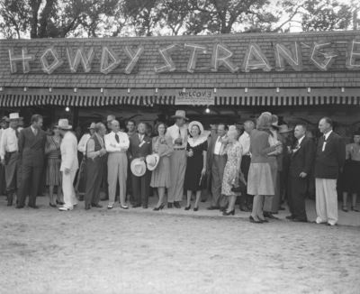 A group poses in front of a "Howdy Stranger" sign at Amon Carter's Shady Oak Farm. The sign was part of a celebration to mark the Fort Worth world premiere of the movie "The Westerner."