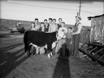 Image shows Wichita Falls ninth annual club show entrant Charles Baker is at the halter of his baby beef. Small boy is Kennith Baker and back of him is W. W. Rice, county agent. From right to left of Charles Baker other 4-H Club boys are: Gaylon Scott, Joe Barton, Junior Montandon, Wade McGuire, Elton Scott, Finis Bratcher and Hope Bratcher. All the boys are standing side by side behind the Calf in pants and a button down shirt, jacket, or vest.
