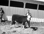 Image shows San Angelo Fat Stock Show. William Carter Henderson, 14, with his baby beef. He is from Burkett. Henderson is outside standing on soil, dirt, and grass, holding his baby Beef by the leash, as a boy in the background leaning on a wall looks on. Published in the Fort Worth Star-Telegram morning edition, March 3, 1940.