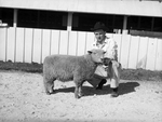 Image shows San Angelo Fat Stock Show. H. L. Bade and the champion Delaine ewe of the show, is shown outside in his one piece jumpsuit, kneeling beside his Ewe. Published in the Fort Worth Star-Telegram morning edition, March 5, 1940.
