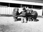 Image shows San Angelo Fat Stock Show. Rushing Sheffield, 10, of San Angelo with some of the winning lambs that he showed at the stock. He is kneeling in front of four Rams holding two by the skin on its chin. Published in the Fort Worth Star-Telegram morning edition, March 5, 1940.