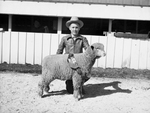 Image shows San Angelo Fat Stock Show. George Max Brandenberger, 14, with his champion lamb, is seen outside in his hat and zipped up jacket, kneeling down on one knee in front of his lamb. Published in the Fort Worth Star-Telegram morning edition, March 7, 1940.