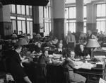 Employees in the Star-Telegram Classified Ad Department prior to the change of office. In the foreground, left to right, are Ruby Alcorn, Elizabeth Defee, and Grace Mitchell. On the opposite side of the ad board, left to right, are Eula Meador, Stella Leath and Lois Epps. Lula Koepp directly back of Stella Leath, and Myrtle Kirklan is standing by her side. Guy Vance, credit manager, is standing at left. Otis Stovall is standing at right. The department floor is filled with desks, table lamps and people working. The women are wearing dresses and the men are in long-sleeve shirts, trousers and ties. Mr. Stovall is wearing a vest as well. On some of the desks are telephones, as well as adding machines and stacks of paper. There are card catalog drawers and filing cabinets among the room.