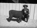San Angelo Fat Stock Show first prize Rambouillet ewe lamb shown by Bade Brothers, Sterling City, Texas with L. H. Bade holding the lamb by the skin on it's front neck; March 1-4, 1940. Bade is crouching and wearing a cowboy hat and western clothing.