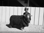 San Angelo Fat Stock Show winner George Johanson with his champion Delaine ram, is wearing a suit and hat, seen outside holding his ram in front of a wooded fence; March 1-4, 1940.