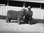 San Angelo Fat Stock Show winner P. T Underwood, Denton, Texas, and his champion Rambouillet Ram, is outside seen holding the Ram by the skin on it's bottom chin; March 1-4, 1940.. He is wearing a hat, cowboy boots, suit and tie.
