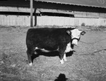 Amarillo Fat Stock Show. Shot of the calf fed by James Jones of Tarzan, the animal came from the C Ranch near Midland. The calf is outside standing on a ground of grass and hay. The calf is seen with a chain and strap attached to its face.