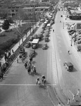 Long line of cars and buses carrying members of the 4-H Club rodeo (sponsored by Montgomery Ward and Company) from the Will Rogers Coliseum to the Stock Show grounds. Shown here is a long line of buses and trucks in which more than 9,000 youngsters and their leaders paraded.
