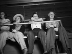 4-H Club rodeo (sponsored by Montgomery Ward and Company) attendees (left to right) Anita Whatley, Morilla Modrall, and Geraldine Osborn, all of Brazos Valley, Texas, are sitting in between metal rails as they look on watching the rodeo.