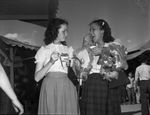Southwestern Exposition and Fat Stock Show. 4-H Club day attendees (left to right) Charlotte Allen and Jessie Lou Bond, both of Bogota, Texas, both standing outside facing each other with a lot of items in hand eating a snow cone.