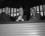 Southwestern Exposition and Fat Stock Show visitors (left to right) C. R. Jones of Denver, Colorado; John B. Davis, secretary manager of the Southwestern Exposition and Fat Stock Show and W. H. Weeks, Kansas City, Missouri. All three men are sitting together spectating the rodeo.