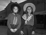 Southwestern Exposition and Fat Stock Show visitors Mary and Wilma Dean Newman of Durant, Oklahoma, standing side by side each other outside in cowgirl uniforms.