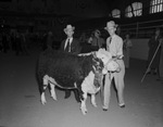 Southwestern Exposition and Fat Stock Show 4-H Club boy Kenneth Lewis of Nolan County, with his champion Hereford. Behind the Hereford is R. B. Tate, county agent. Both men are seen standing behind the calf in a room full of other people.