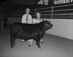 Southwestern Exposition and Fat Stock Show attendee G. C. Whatley Junior, Groom, Texas with his champion Aberdeen-Angus steer. County Agent Percy Mims is standing behind the steer. The two young men wearing hats and a light coat are standing behind a calf in a room.