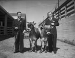 Southwestern Exposition and Fat Stock Show visitors and businessmen John B. Collier Junior, right, president and manager of the Fort Worth Poutry and Egg Company, and August H. Kaufman, superintendant of the cheese factory at Stephanville and a number of other towns are shown with two registered Jersey bulls they purchased. The two men are seen outside in suits holding both bulls by the leash.