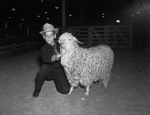Southwestern Exposition and Fat Stock Show participant John Ward Junior of Sonora, Texas with the champion "Type B" Angora he exhibited. Ward Junior is seen in his cowboy gear, bent down on the ground holding his Angora by the hair on it's chin.