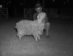 Southwestern Exposition and Fat Stock Show contestant Pete Gulley is shown with the "Type C" doe, exhibited by J. L. Gulley and Sons of Uvalde, Texas. Gulley is seen in a barn on the ground, holding his Type C doe by the long hair on its chin.
