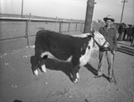 Here are some of the prize-winning beeves in the 1940 South Plains Junior Fat Stock Show held at Lubbock; March 25-27, 1940. Shown here in the picture is Sammy Ares, of Slaton, and his calf that was one of the prize winners in the junior class and was bred by W. W. Brunson of Slaton.