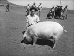 Spur, Texas Future Farmers stock show; March 29-30, 1940. Lester Ball shows his fine Chester White bred gilt that took the championship in that division of the hog show which was an important part of the Spur Future Farmer exhibition.