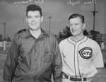 With the Fort Worth Cats' Spring Training coming to an end, Manager Bob Linton is filling in his roster. Left to right are Bill Tarver and Steve Kuk. Tarver is dressed in a button-up shirt. Kuk is a twenty-six year old outfielder. In previous seasons he's had trouble with the bat, but Kuk is a strong defender. Linton is planning to play him in centerfield. Kuk is dressed in the Cats' home uniform.