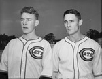 The Fort Worth Cats are wrapping up their Spring Training with a few positions left to fill. Left to right are Wallace Mehrens and Vereal Puckett. Mehrens is a twenty year old, left-handed pitcher. Puckett is a twenty-seven year old, right-handed pitcher. Both men are rookies, playing for a spot on the Cats' pitching staff. They are wearing the Cats' home uniform.