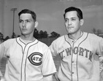 The Fort Worth Cats are wrapping up their Spring Training with a few positions to fill. Left to right are J. R. Moseley and Henry "Prince" Oana. Moseley is one of the many new rookies in camp with the Cats. The twenty-one year old is a right-handed pitcher. Oana is a Hawaiian born outfielder. The thirty year old adds power and a veteran presence to the lineup. Moseley is dressed in the Cats' home uniform while Oana is wearing the road uniform.