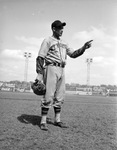 Bob Linton is the manager of the Fort Worth Cats. He is pleased with how the team is shaping up during Spring Training. Linton, thirty-eight, has spent thirteen years in the minor leagues as a catcher. He began managing the Cats in 1939 as a player manager. He also played in seventy-eight games last season. He is standing on the Marshall field, giving directions to his players. Linton is dressed in the Cats' road uniform and holding his catcher's mitt.