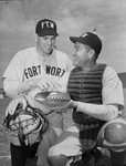 The Fort Worth Cats are ready for their season opener on the road against the Shreveport Sports. The battery is left to right, Ed Greer and Player Manager Bob Linton. Greer is a veteran right-handed pitcher. In addition to managing, Linton will spend about half the games behind the plate. The Cats are dressed in their road uniforms.
