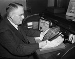Doctor W. O. Talbot, is the dean of Fort Worth, Texas dentists. He is shown admiring the mahogany and silver plaque presented to him Monday night by the Fort Worth District Dental Society. The plaque is in recognition of his forty-six years of active participation in the profession. On the desk is Dr. Talbot's original certificate to practice dentistry, issued in 1894 at Forest, Mississippi. Dr. Talbot is dressed in a three piece suit.