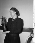 Mrs. Charles E. Armstrong is admiring the gold loving cup she won for selling the most tickets to the midnight varieties at the Worth Theater . The contest was presented by the Delta Rho Delta sorority for the benefit of the Lena Pope Home. Mrs. Armstrong turned in eighty-six dollars for the children. She is standing against the wall, wearing a dark colored button-up dress.