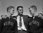 The Southwestern Exposition and Track Meet kicked off Friday in Fort Worth, Texas. Left to right are Dee Ezell, Coach Lacy Turner, and Don Ezell. The famous football twins are making good in track too. They are from Wink, Texas, representing Wink High School. Dee and Don are both wearing track suits with "Wildcats" across the chest. Coach Turner is dressed in a suit.