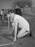 The Southwestern Exposition and Track Meet kicked off Friday in Fort Worth, Texas. Gabby Hamil is the Bucks' speedster and football star from Breckenridge High School. Hamil won his first heat in the 100-yard dash, but the halfback lost in the semifinals. He is positioned at the starting line, wearing his track uniform. Two people are in the background, watching from the bumper of an automobile.